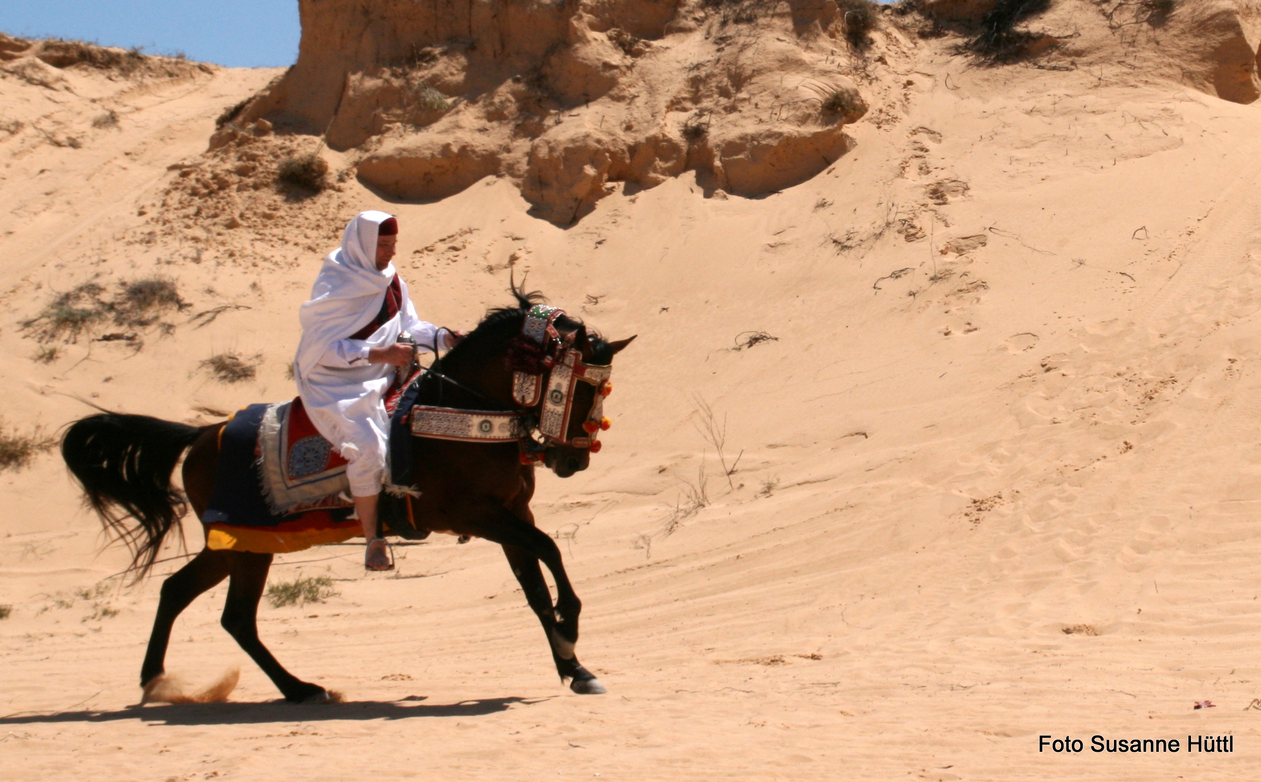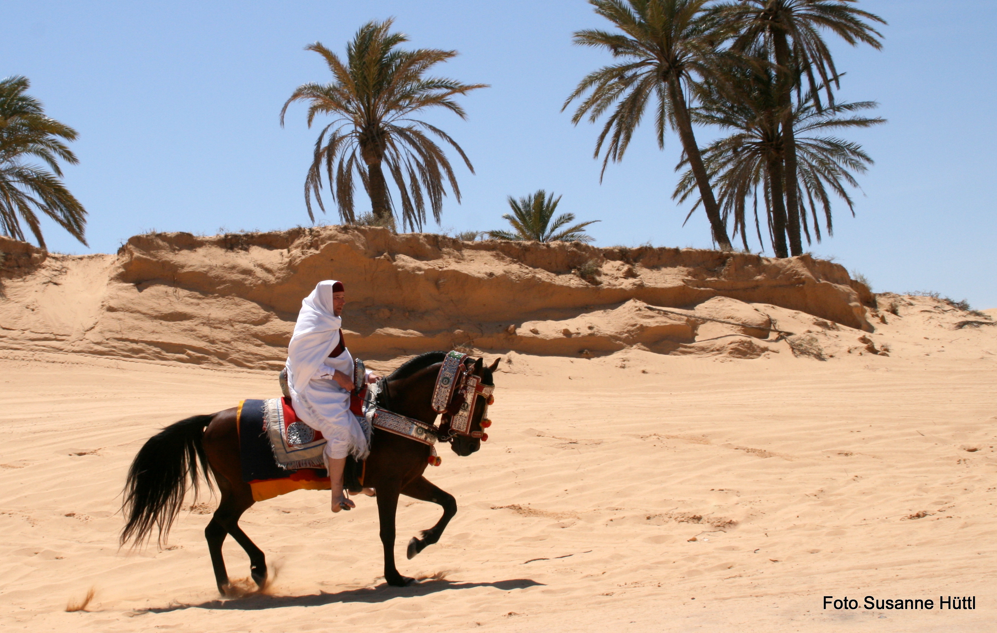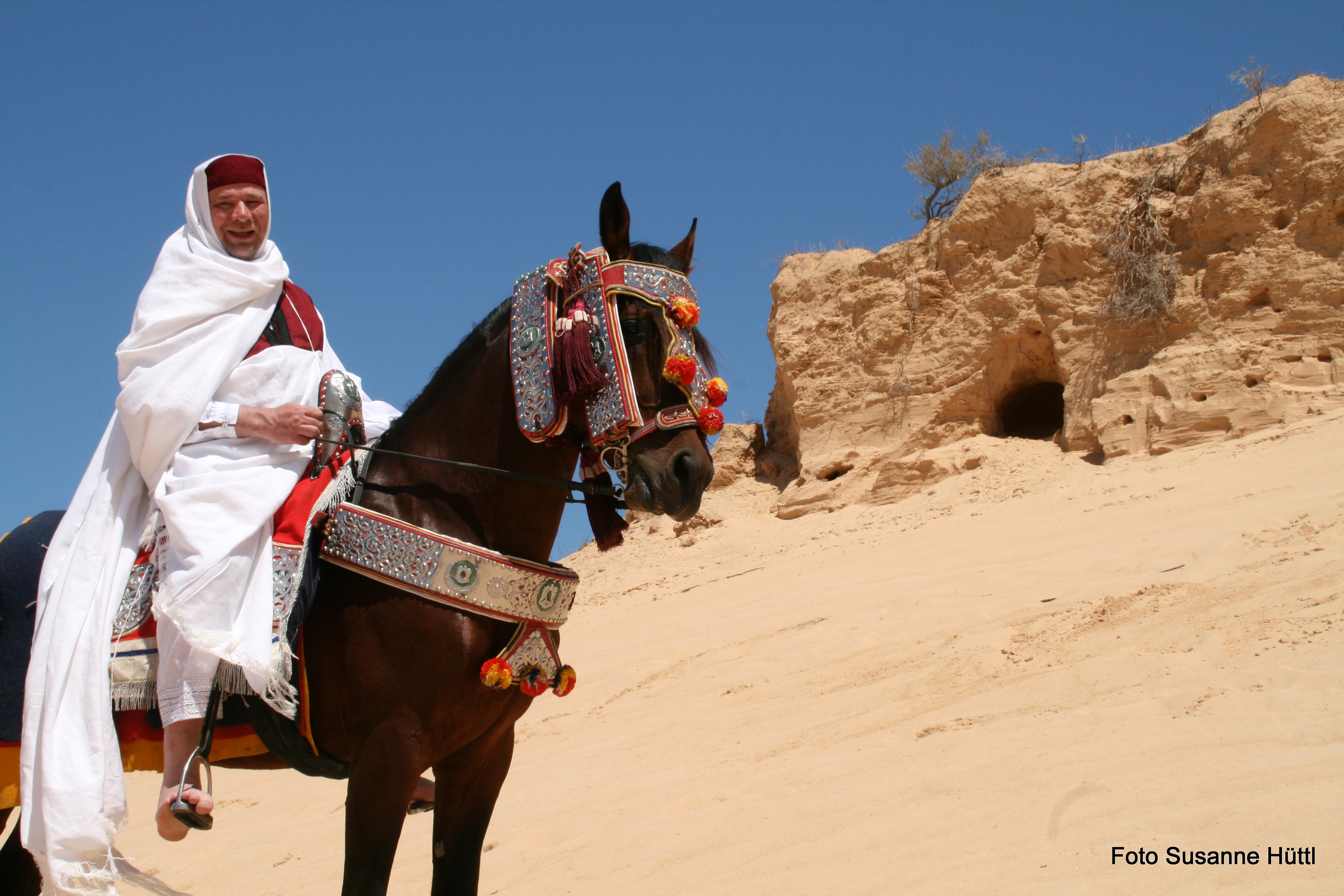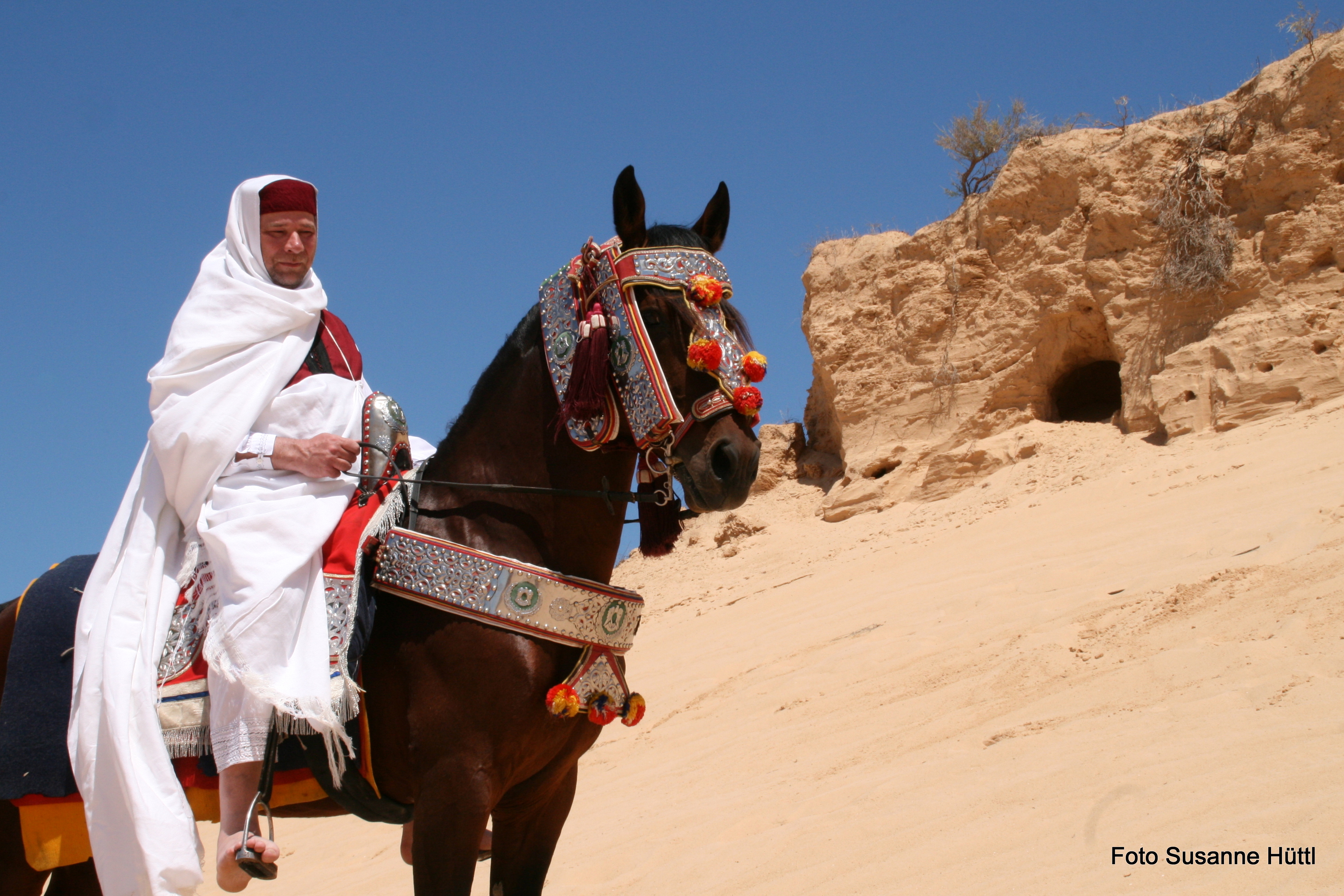 Alles ist hier authentisch: Sattel, Schmuck, Kleidung... und nicht zu vergessen: Berberhengst Bruce.